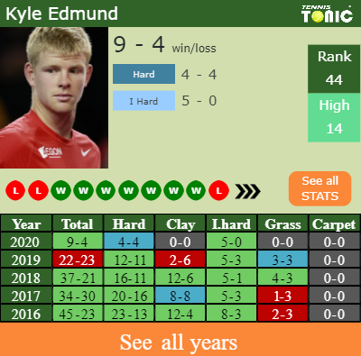 Edmund has a 9-4 win-loss record in 2020, 4-4 on hard (See FULL STATS).
