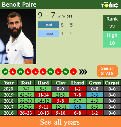 the French player has a 9-7 win-loss record in 2020, 8-5 on hard (See FULL STATS).