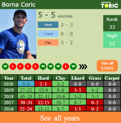 Borna has a 5-5 win-loss record in 2020, 2-3 on hard (See FULL STATS).