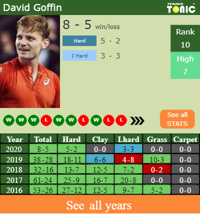David has a 8-5 win-loss record in 2020, 5-2 on hard (See FULL STATS).