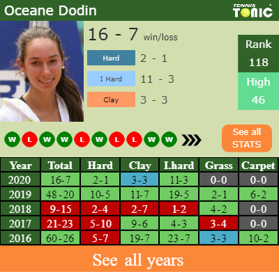Dodin has a weak record in the last 9 years having won 44% of her matches (259-201). 2-1 on hard in 2020. In connection with her performance on the same surface of this tournament, Dodin has a 262-155 record in the last 9 years on hard.