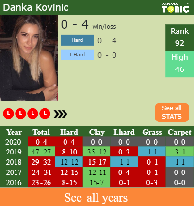 Talking about her overall career, Kovinic has an overall 311-238 record. She has negative 83-99 record on hard.