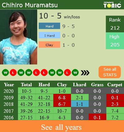 Muramatsu has a weak record in the last 7 years having won 49% of her matches (125-122). 1-0 on clay in 2020. Talking about her performance on the same surface of this competition, Muramatsu has a 180-120 record in the last 7 years on clay.