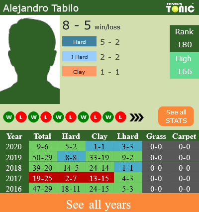 Alejandro has a 9-6 win-loss record in 2020, 1-1 on clay (See FULL STATS).