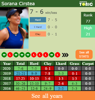 Sorana has a 7-6 win-loss record in 2020, 7-5 on hard (See FULL STATS).