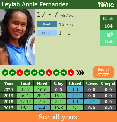 Annie Fernandez has a 17-7 win-loss record in 2020, 16-6 on hard (See FULL STATS).
