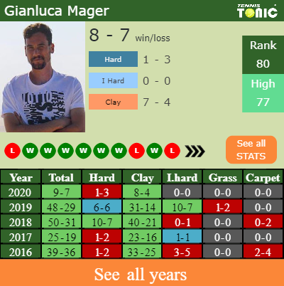 Mager has a 9-7 win-loss record in 2020, 1-3 on hard (See FULL STATS).