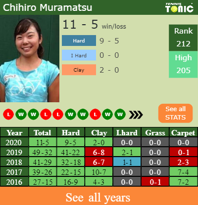 Muramatsu has a losing win-loss record in the last 7 years having won 48% of her matches (132-122). 2-0 on clay in 2020. Regarding her performance on the same surface of this competition, Muramatsu has a 181-120 record in the last 7 years on clay.