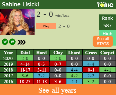 Lisicki has a 2-0 win-loss record in 2020, 2-0 on clay (See FULL STATS).