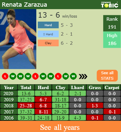 Zarazua has a 13-6 win-loss record in 2020, 6-2 on clay (See FULL STATS).