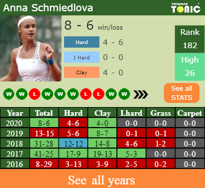 Anna Schmiedlova has a solid record in the last 10 years having won 64% of her matches (684-386). 4-0 on clay in 2020. In connection with her performance on the same surface of this competition, Anna Schmiedlova has a 303-204 win-loss record in the last 10 years on clay.
