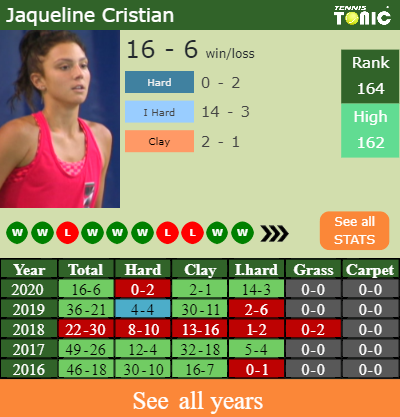 Cristian has a losing record in the last 6 years having won 37% of her matches (345-201). 2-1 on clay in 2020. In connection with her performance on the same surface of this tournament, Cristian has a 180-114 record in the last 6 years on clay.