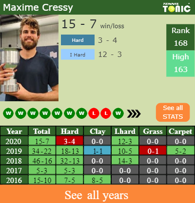 Cressy has a solid record in the last 4 years having won 62% of his matches (200-122). 3-4 on hard in 2020. Regarding his performance on the same surface of this competition, Cressy has a 115-58 record in the last 4 years on hard.