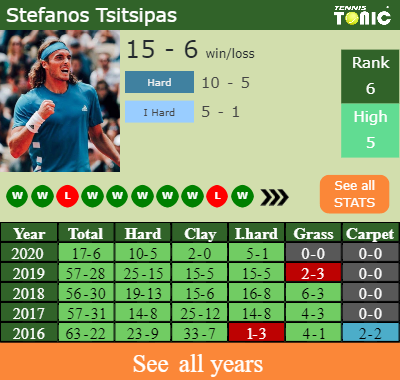 Tsitsipas has a unfavourable win-loss record in the last 6 years having won 36% of his matches (377-215). 10-5 on hard in 2020. In connection with his performance on the same surface of this tournament, Tsitsipas has a 290-139 win-loss record in the last 6 years on hard.