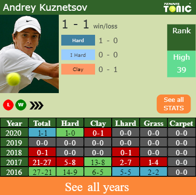 Kuznetsov has a winning record in the last 10 years having won 54% of his matches (189-163). 1-0 on hard in 2020. In connection with his performance on the same surface of this tournament, Kuznetsov has a 216-158 win-loss record in the last 10 years on hard.