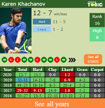 Khachanov has a 12-7 win-loss record in 2020, 11-5 on hard (See FULL STATS).