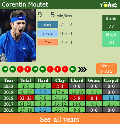 the French player has a 9-5 win-loss record in 2020, 7-2 on hard (See FULL STATS).