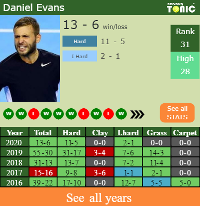 Evans has a 13-6 win-loss record in 2020, 11-5 on hard (See FULL STATS).