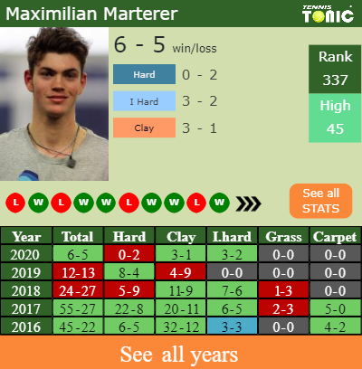 Marterer has a solid record in the last 9 years having won 60% of his matches (565-371). 3-1 on clay in 2020. Talking about his performance on the same surface of this event, Marterer has a 259-163 win-loss record in the last 9 years on clay.