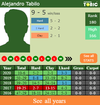 Alejandro has a 10-6 win-loss record in 2020, 2-1 on clay (See FULL STATS).