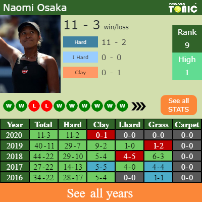 Osaka has a 11-3 win-loss record in 2020, 11-2 on hard (See FULL STATS).