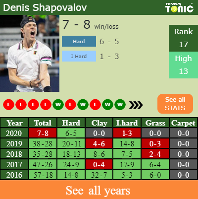 Denis has a 7-8 win-loss record in 2020, 6-5 on hard (See FULL STATS).