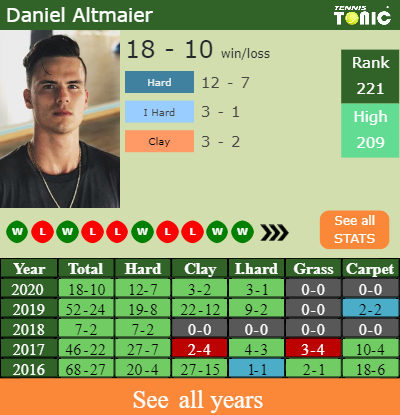 The German has a 18-10 win-loss record in 2020, 3-2 on clay (See FULL STATS).