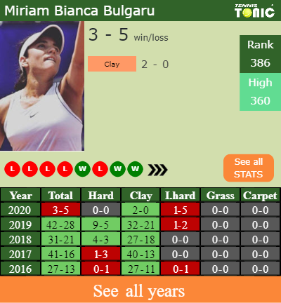 The Romanian has a 3-5 win-loss record in 2020, 2-0 on clay (See FULL STATS).
