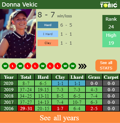 Vekic has a 8-7 win-loss record in 2020, 6-5 on hard (See FULL STATS).