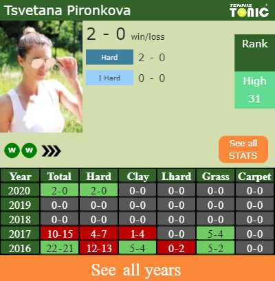 Tsvetana has a 2-0 win-loss record in 2020, 2-0 on hard (See FULL STATS).