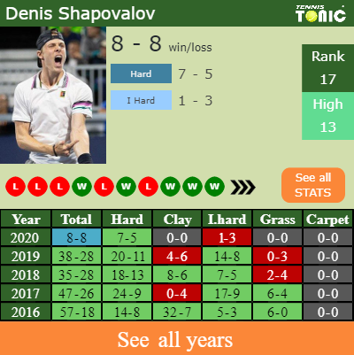 Denis has a 8-8 win-loss record in 2020, 7-5 on hard (See FULL STATS).