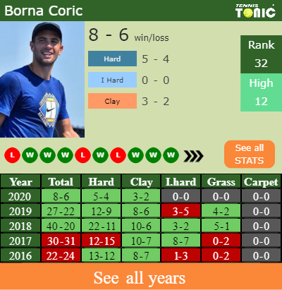 Borna has a 8-6 win-loss record in 2020, 5-4 on hard (See FULL STATS).