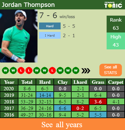 This will be the 2nd time that Borna Coric and Jordan Thompson face off. The head to head is 1-0 for Coric (see full H2H stats), 1-0 on hard.