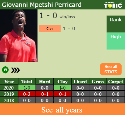 Mpetshi Perricard has a losing win-loss record in the last 3 years having won 33% of his matches (1-2). 1-0 on clay in 2020. Regarding his performance on the same surface of this event, Mpetshi Perricard has a 1-1 record in the last 3 years on clay.