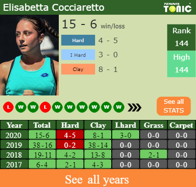 Cocciaretto has a 15-6 win-loss record in 2020, 8-1 on clay (See FULL STATS).
