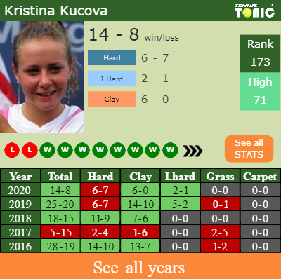 Kristina has a 14-8 win-loss record in 2020, 6-0 on clay (See FULL STATS).