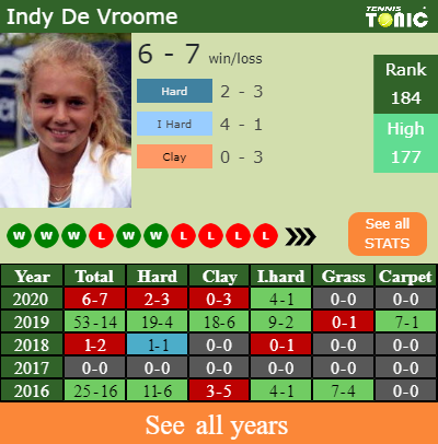 De Vroome has a 6-7 win-loss record in 2020, 0-3 on clay (See FULL STATS).