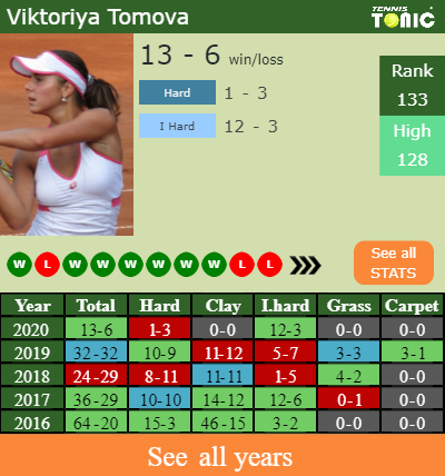 Viktoriya has a 13-6 win-loss record in 2020, 0-0 on clay (See FULL STATS).