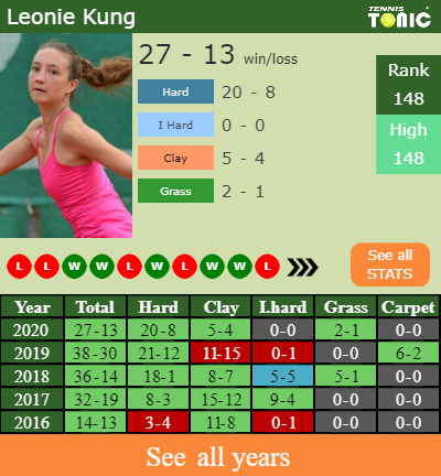 Kung has a 27-13 win-loss record in 2020, 5-4 on clay (See FULL STATS).