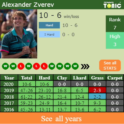 Zverev has a solid record in the last 8 years having won 65% of his matches (324-178). 10-6 on hard in 2020. Regarding his performance on the same surface of this tournament, Zverev has a 129-72 record in the last 8 years on hard.
