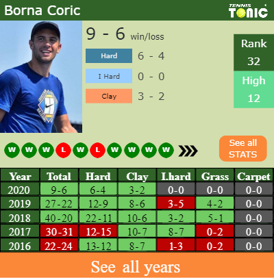 Borna has a 9-6 win-loss record in 2020, 6-4 on hard (See FULL STATS).