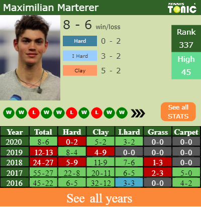 The Austrian has a 12-9 win-loss record in 2020, 0-0 on clay (See FULL STATS).