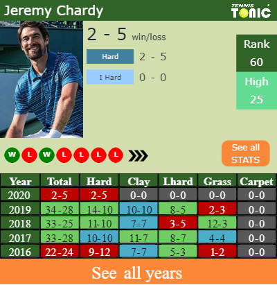 Chardy has a 2-5 win-loss record in 2020, 0-0 on clay (See FULL STATS).