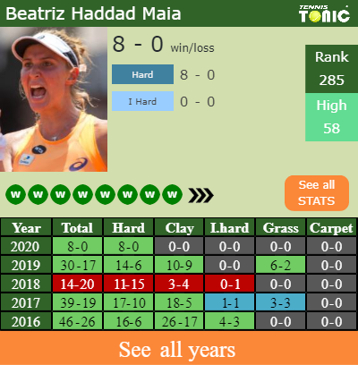 Haddad Maia has a solid win-loss record in the last 9 years having won 63% of her matches (268-156). 8-0 on hard in 2020. Regarding her performance on the same surface of this tournament, Haddad Maia has a 103-55 record in the last 9 years on hard.