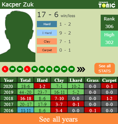 Zuk has a solid record in the last 5 years having won 60% of his matches (109-72). 7-1 on clay in 2020. In connection with his performance on the same surface of this competition, Zuk has a 36-33 win-loss record in the last 5 years on clay.