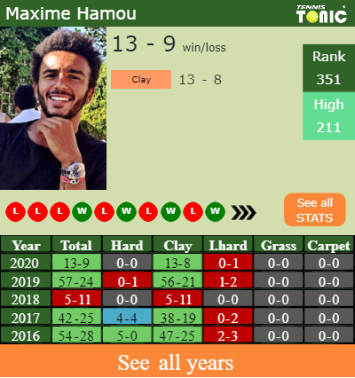 Hamou has a 13-9 win-loss record in 2020, 13-8 on clay (See FULL STATS).