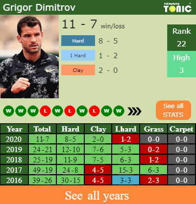 Grigor has a 11-7 win-loss record in 2020, 2-0 on clay (See FULL STATS).