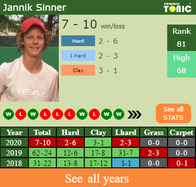 Sinner has a 7-10 win-loss record in 2020, 3-1 on clay (See FULL STATS).