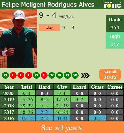 Meligeni Rodrigues Alves has a 9-4 win-loss record in 2020, 9-4 on clay (See FULL STATS).
