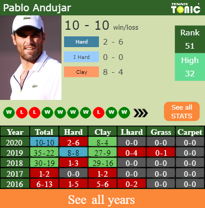 Andujar has a negative record in the last 10 years having won only 48% of his matches (192-209). 8-4 on clay in 2020. . In connection with his performance on the same surface of this competition, Andujar has a 147-100 win-loss record in the last years on clay.